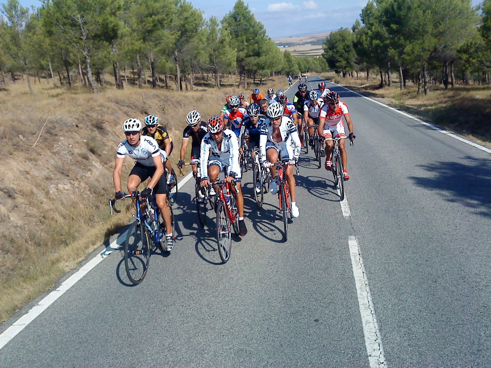 He quedado gratamente sorprendido porque en la grupeta han aparecido varios colegas nuevos, un tal Quique con una flamante GIANT al que hay que recolocar convenientemente en ella, dá la impresión de estirar poco la pierna, eviene de la mountain bike y quiere experimentar cosas mas fuertes. Habrá que animarlo para que la adaptación sea lo menos traumática posible. Otro “nuevo” que no lo es ya que tiene sus batallas en este pelotón, no es otro que Hector, ojo con este tío que como coja la forma lo vamos a conocer rápidamente. Bienvenido al club Hector y enhorabuena Papito!!!!!!. Tambien Charly el "tiburon del Ebro" ha dejado claro que para preparar el triatlon nada mejor que entrenar la bici con nosotros.